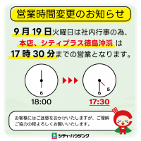 お知らせ 【9/19(火)臨時営業時間変更のお知らせ】